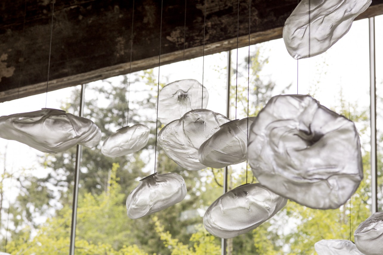 吹きガラスが熱いうちに、たっぷりとひだを寄せておいた高耐熱グラスファイバーのファブリックの上にゆっくりと落とし込みます。