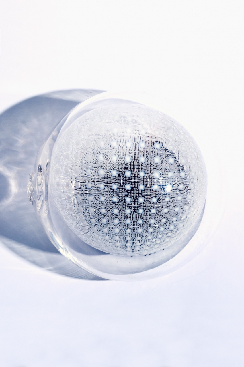 型にホワイトガラスを流し込み、そこに丸形のコパーメッシュプレートをのせます。そして、吹きガラスで半球形に整えたクリアグローブをのせます。