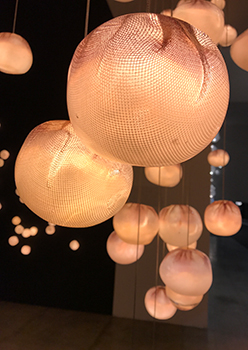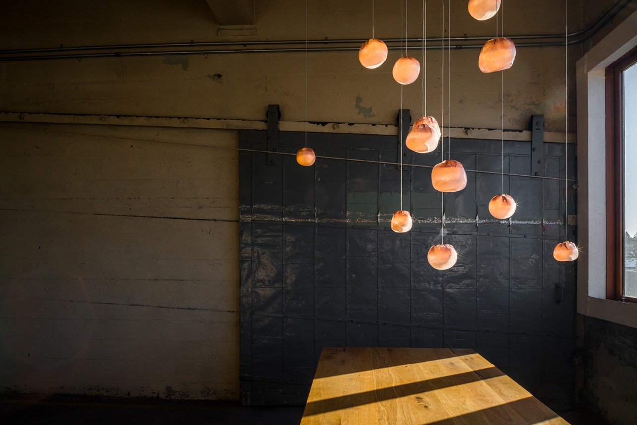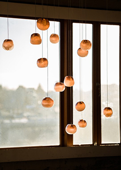 中心にあるホワイトガラスがコパーメッシュから滲み出て、グローブの底の方はホワイトに、またトップはコパーメッシュが寄り重なって