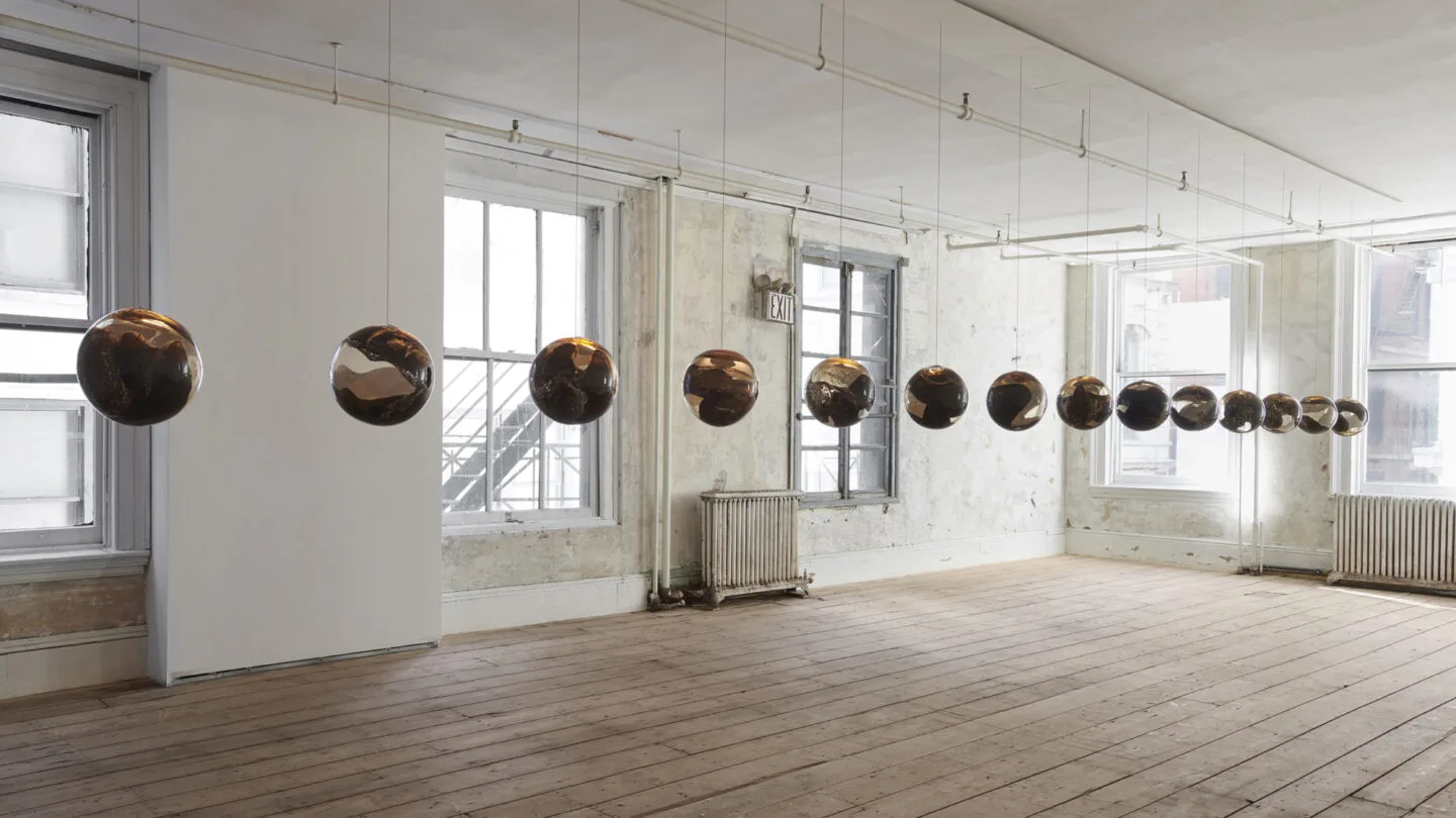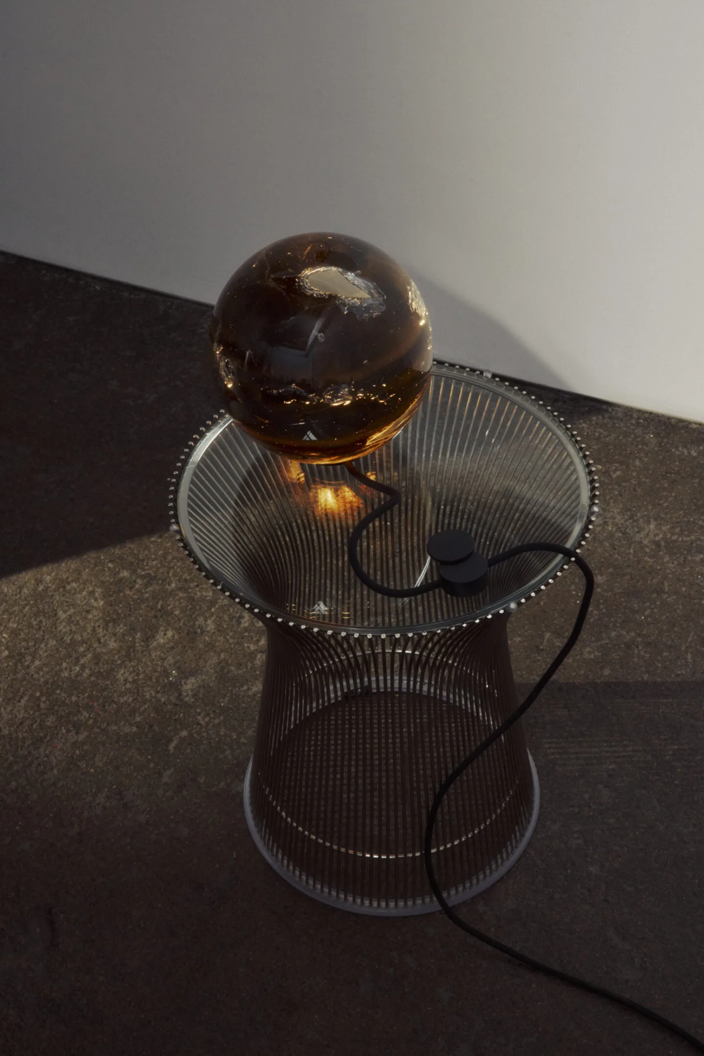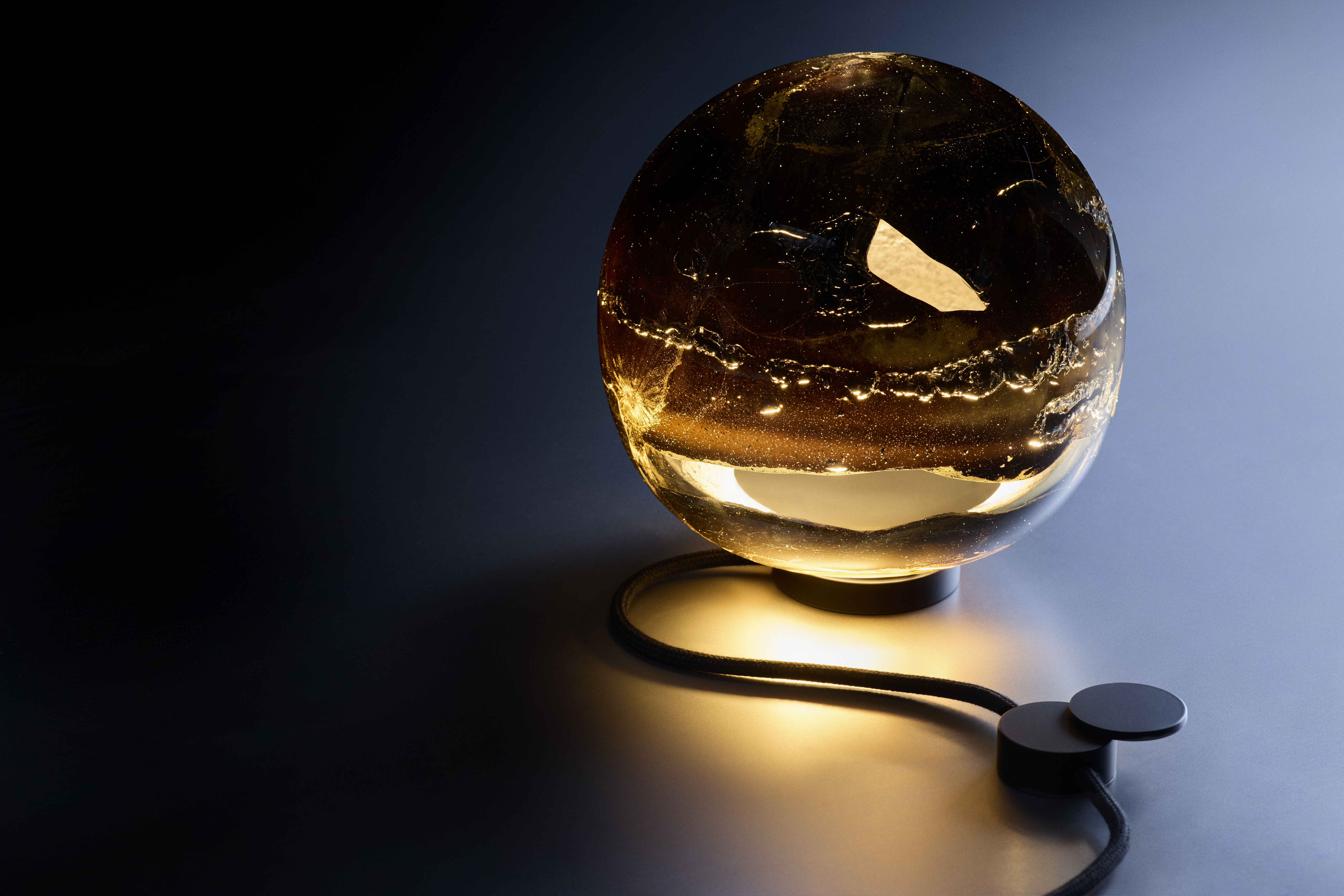 「93」シリーズは、加熱した吹きガラスに溶融アルミニウムを直接流し込むことで制作されます。ガラスの中でアルミニウムが流動し、酸化し、冷却されていく過程で生じる痕跡をそのまま内部に留めることで、圧力や熱、そして変化の瞬間を閉じ込めた造形が生まれます。そのフォルムは彫刻的であると同時に、素材の振る舞いを記録するドキュメントとしての側面も備えています。