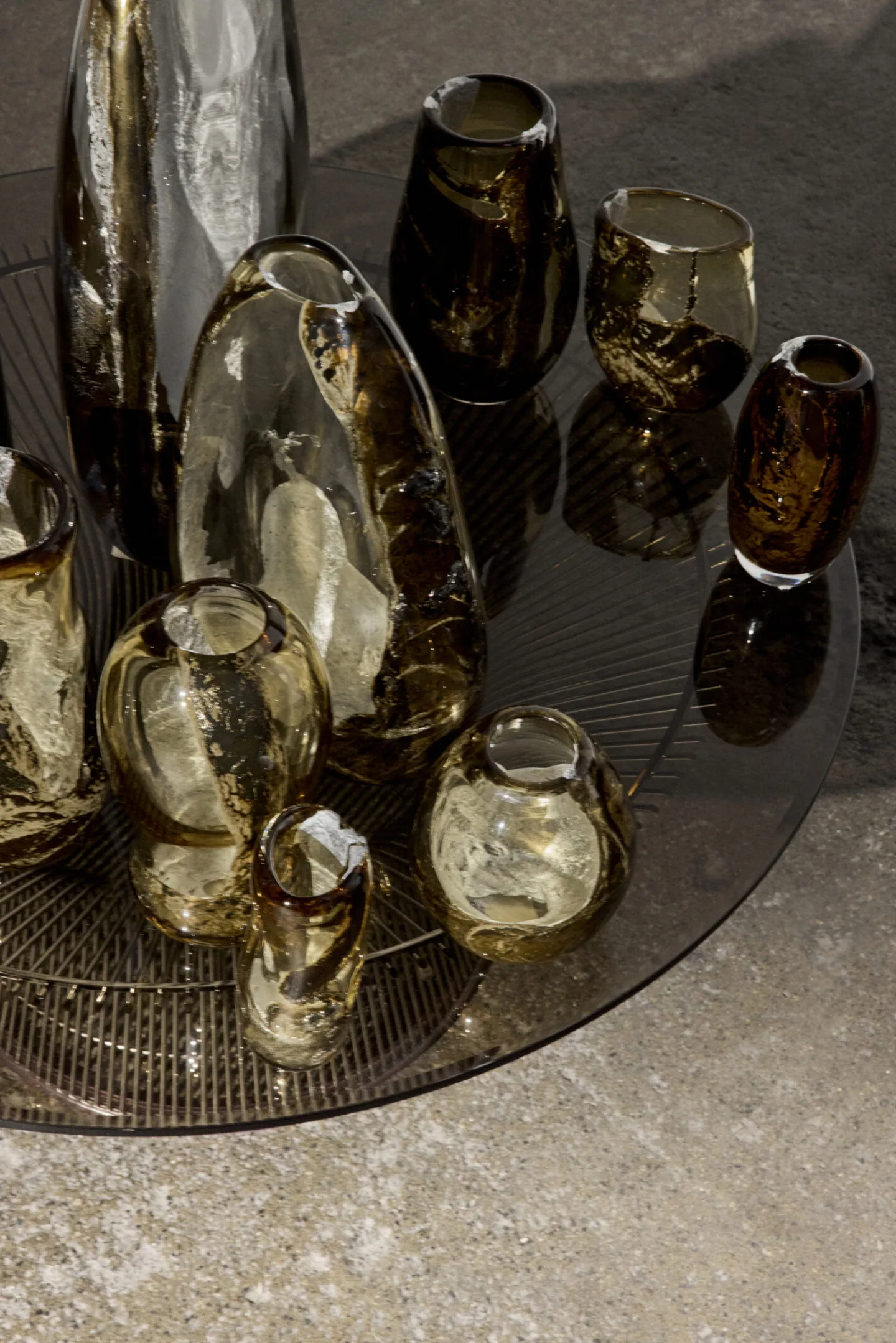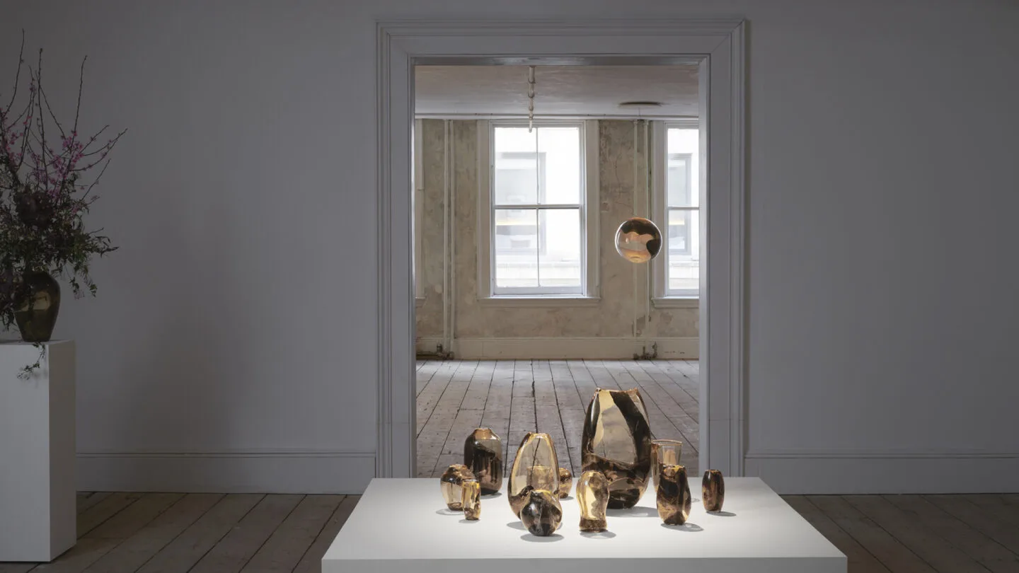 職人が素材の動きと対話しながら成形を行うことで、アルミニウムはガラスの内側を流れ、その軌跡をリアルタイムに刻み込みます。こうして完成する「93」は一点一点異なる表情を持ちます。