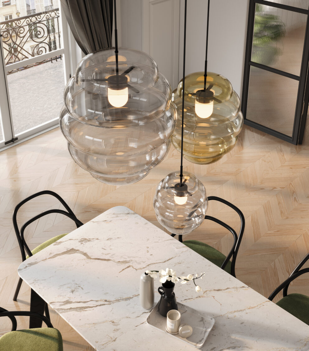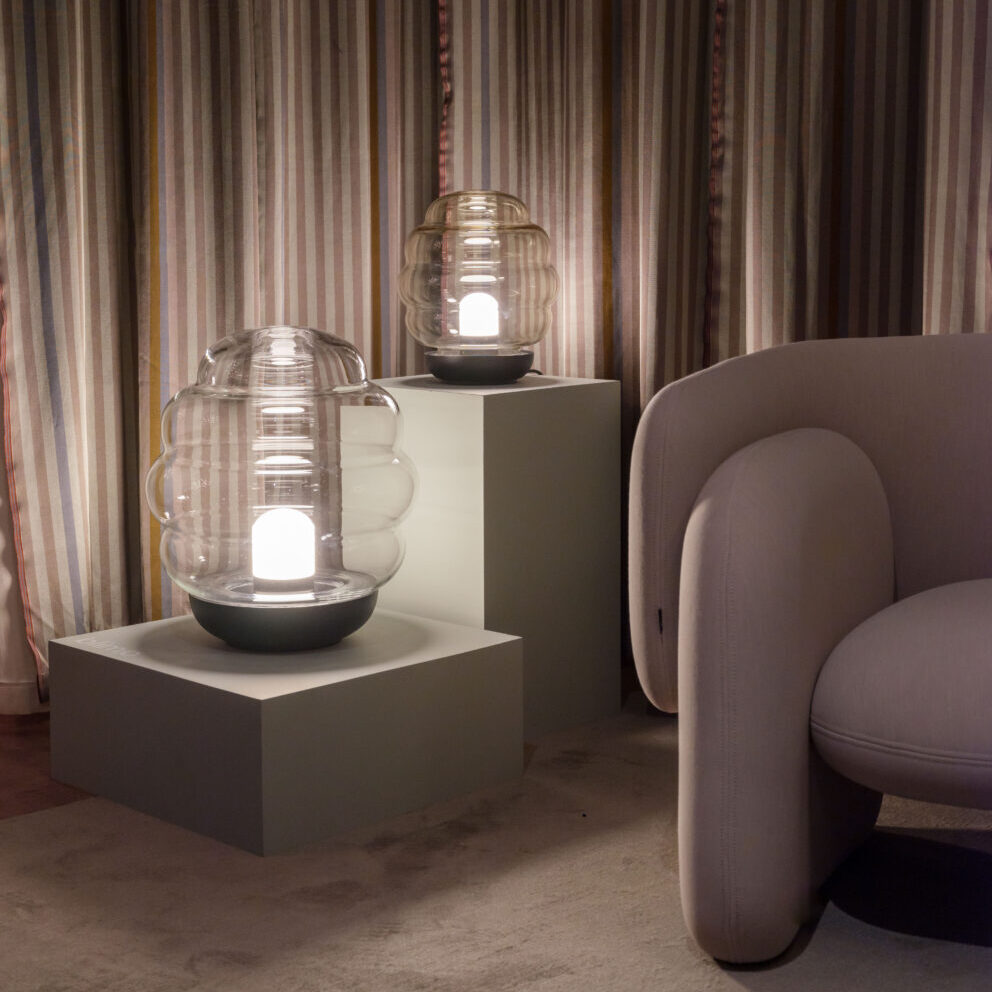 優美で軽快に浮遊する雄大な雲を連想させるBlimp。 ボマにとって初めての国際的なコラボレーションのパートナー、スイスのデザイナーチームBig-Game。 彼らにとってもガラス素材を使うデザインは初めての経験となりました。 手吹きガラスの限界に挑戦しているサイズ感は、トップレベルの熟練したガラス職人にしか創り出されないコレクションです。