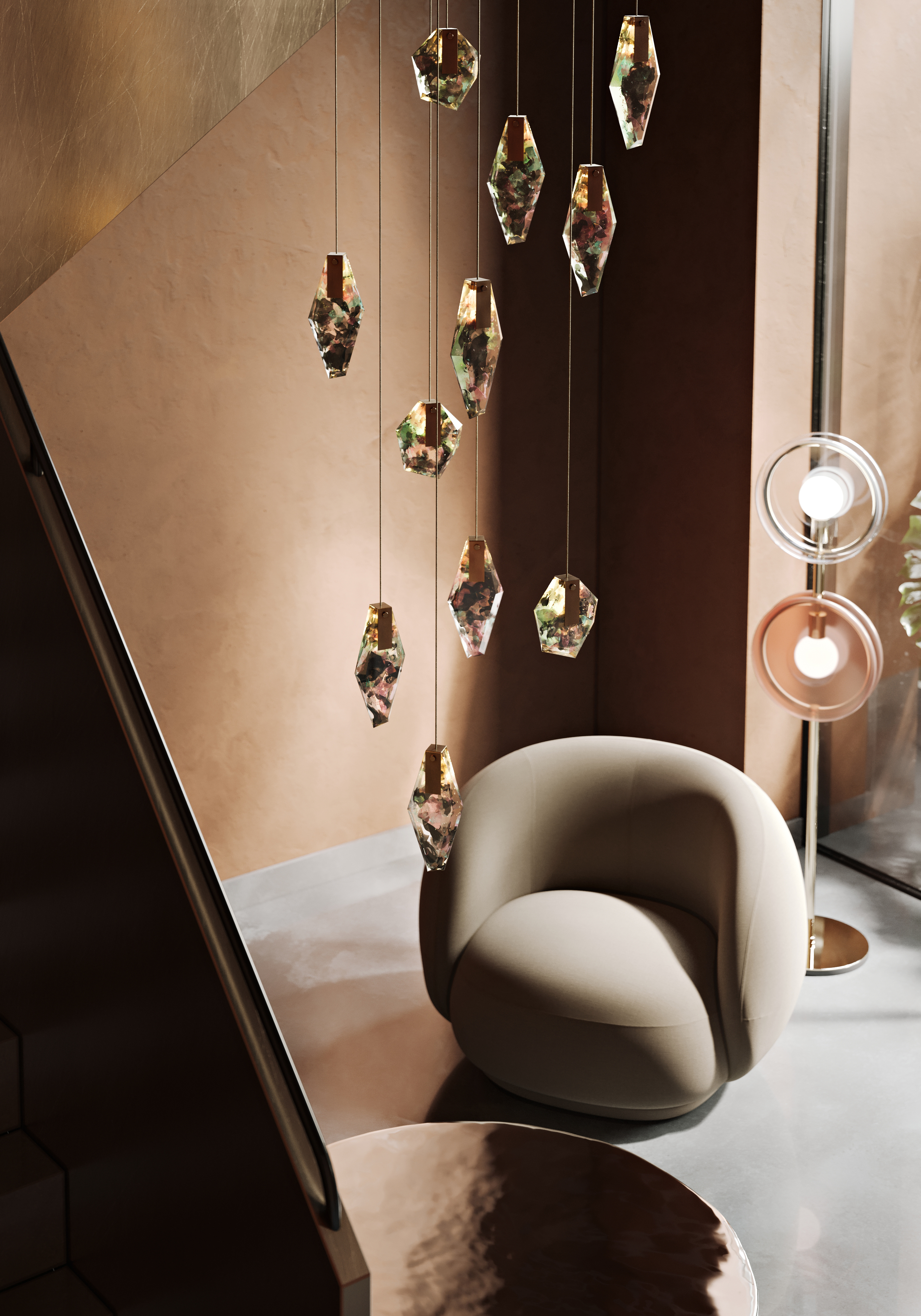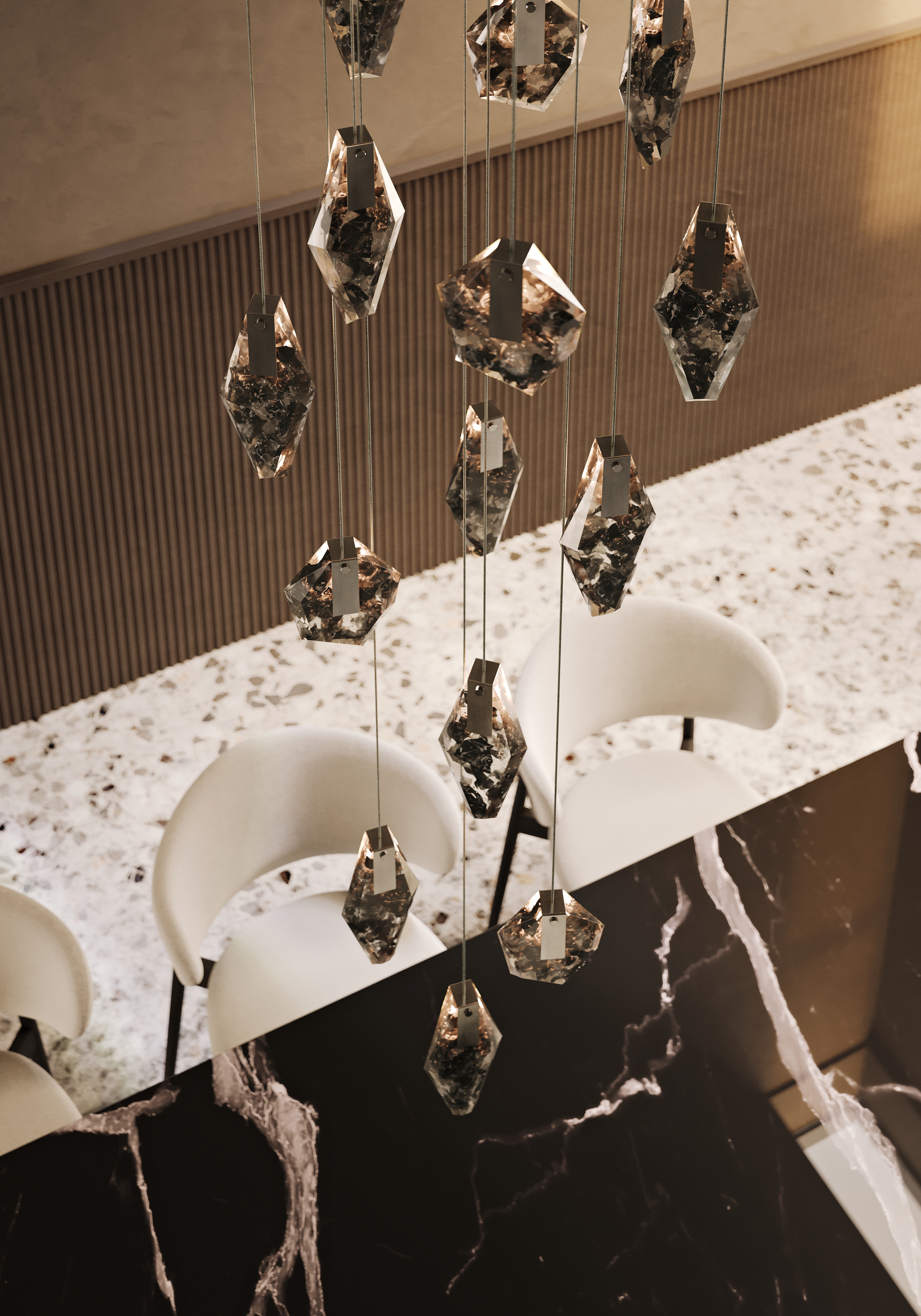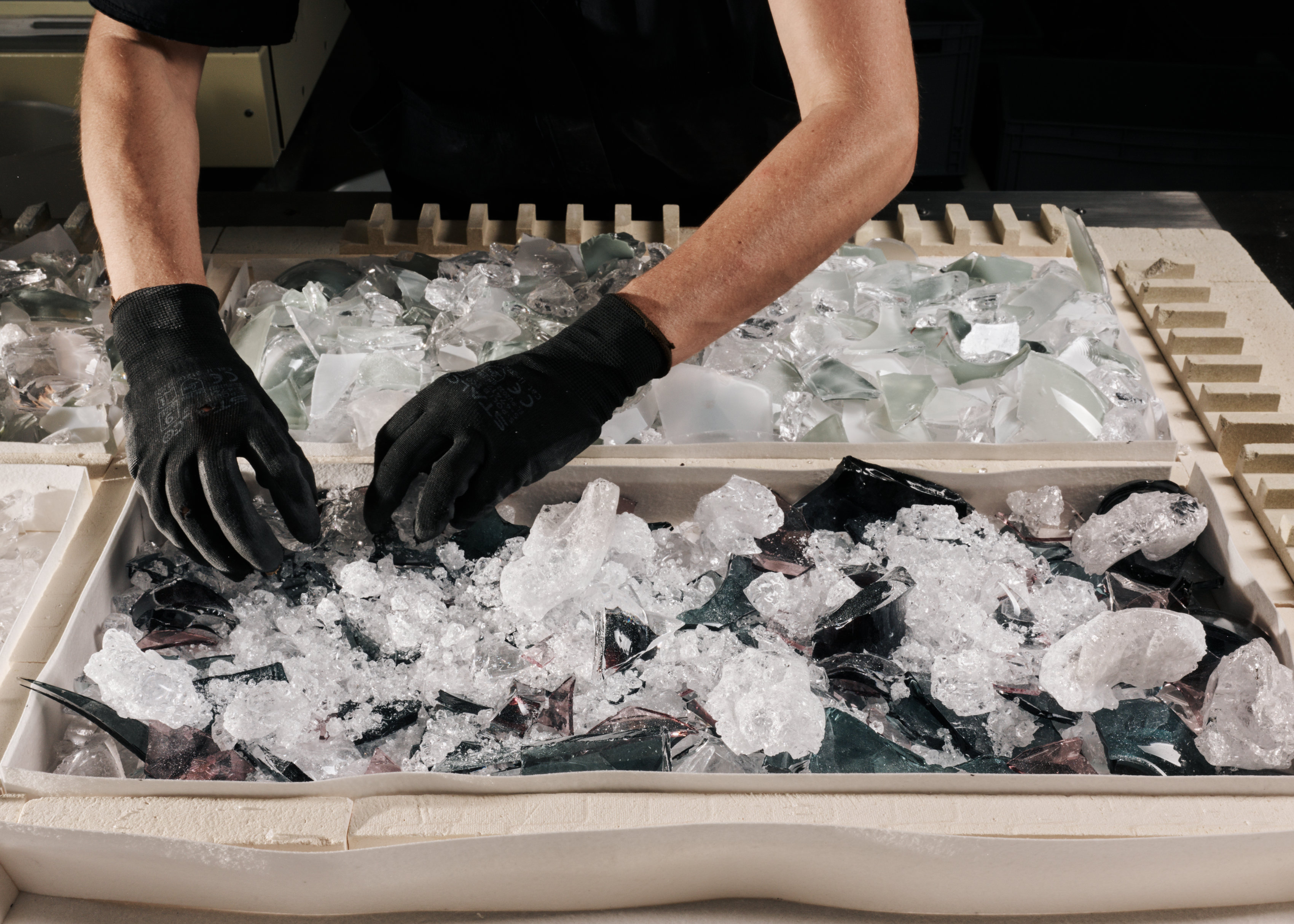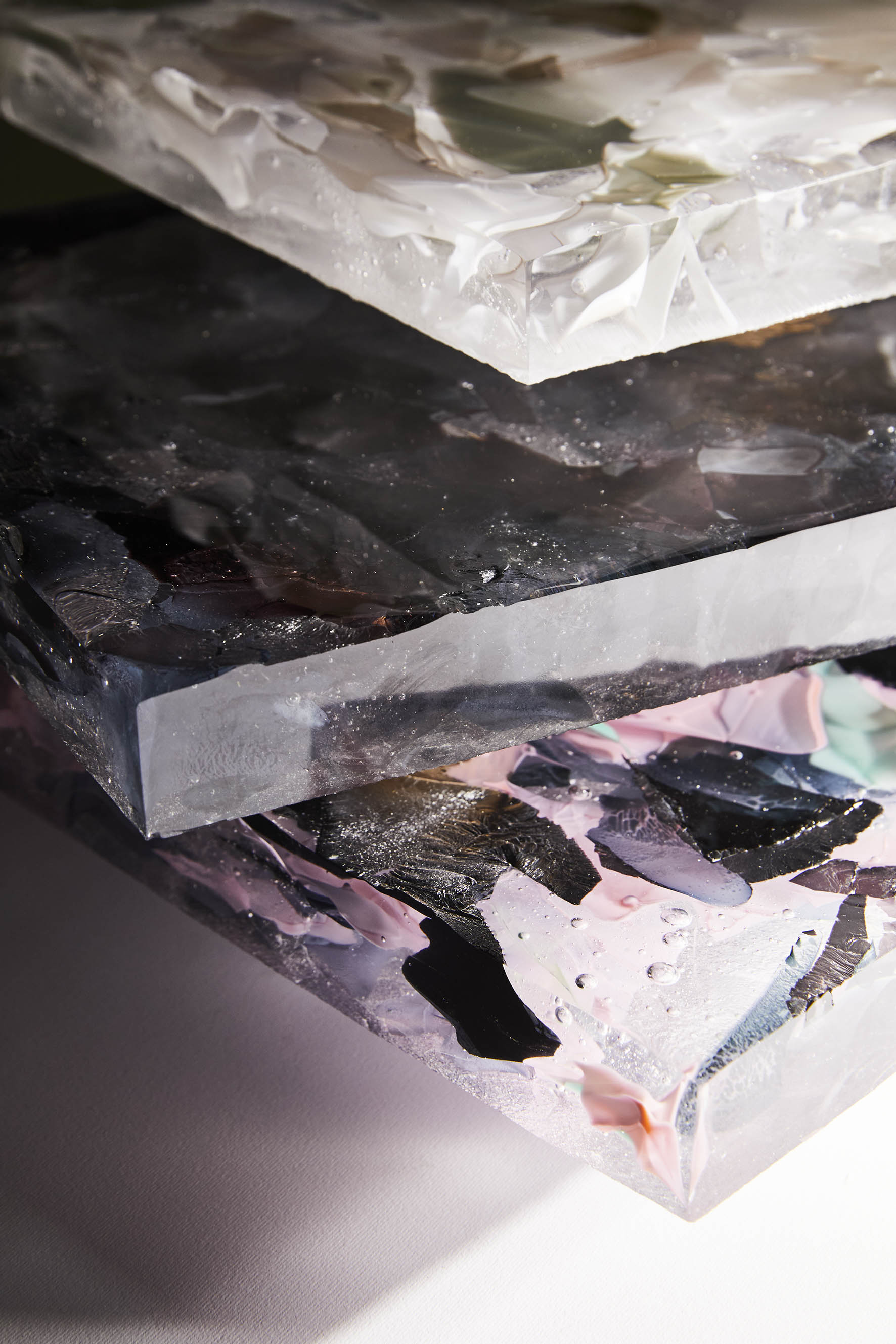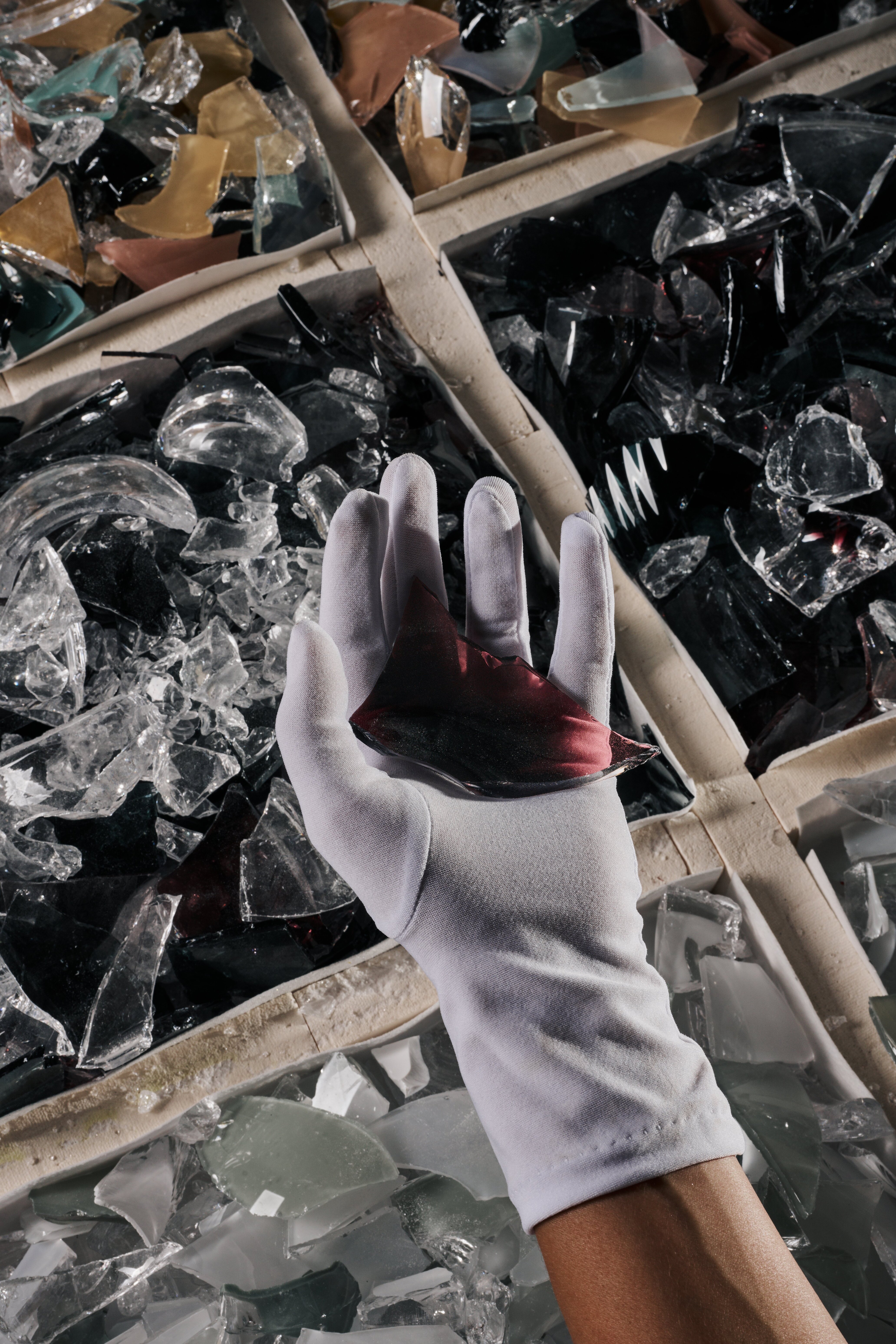 廃棄するものに新たな命を吹き込み、複雑なカラーとレイヤーがあるこのガラス素材は、空間に光と反射の魅惑的な輝きをもたらします。