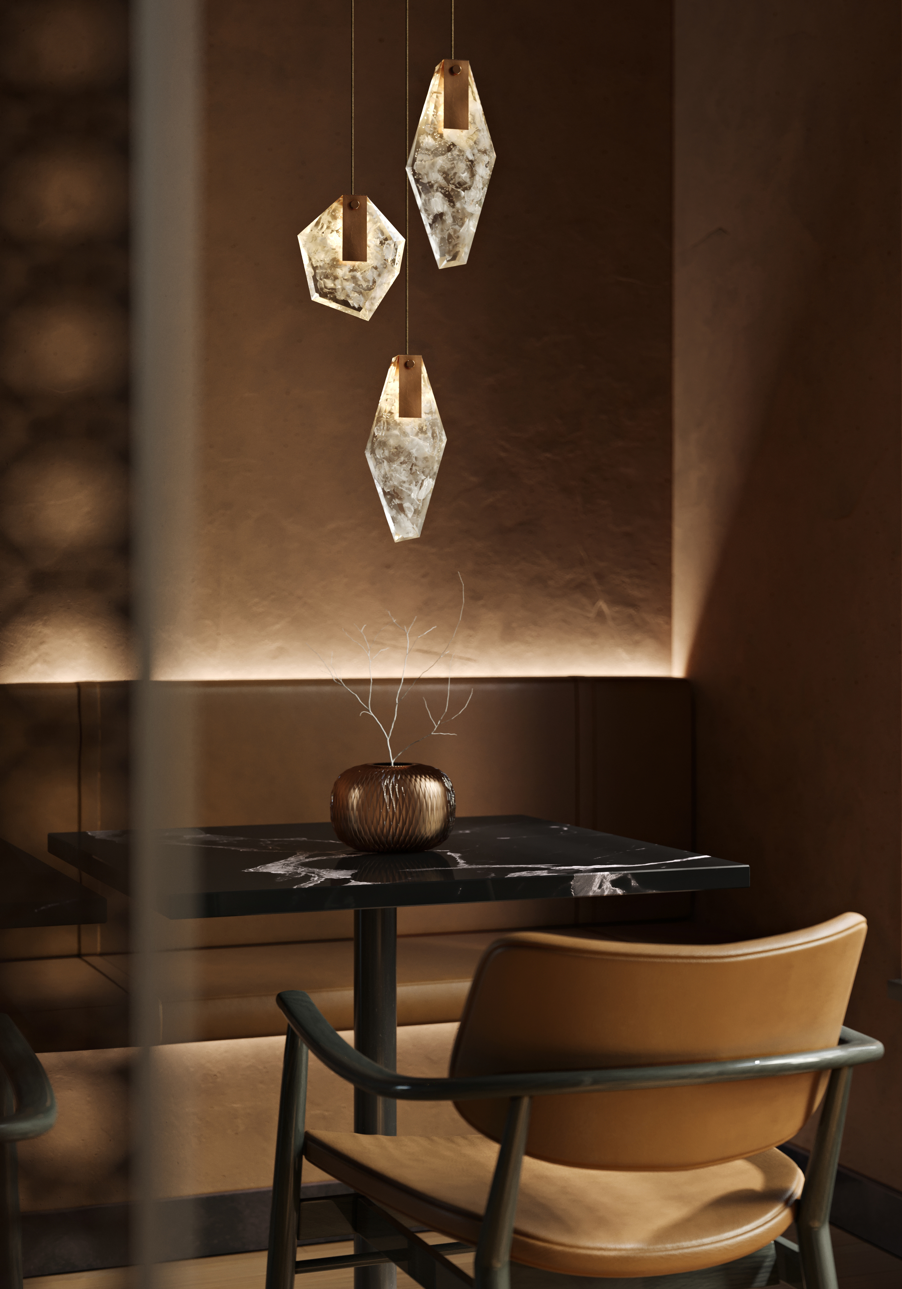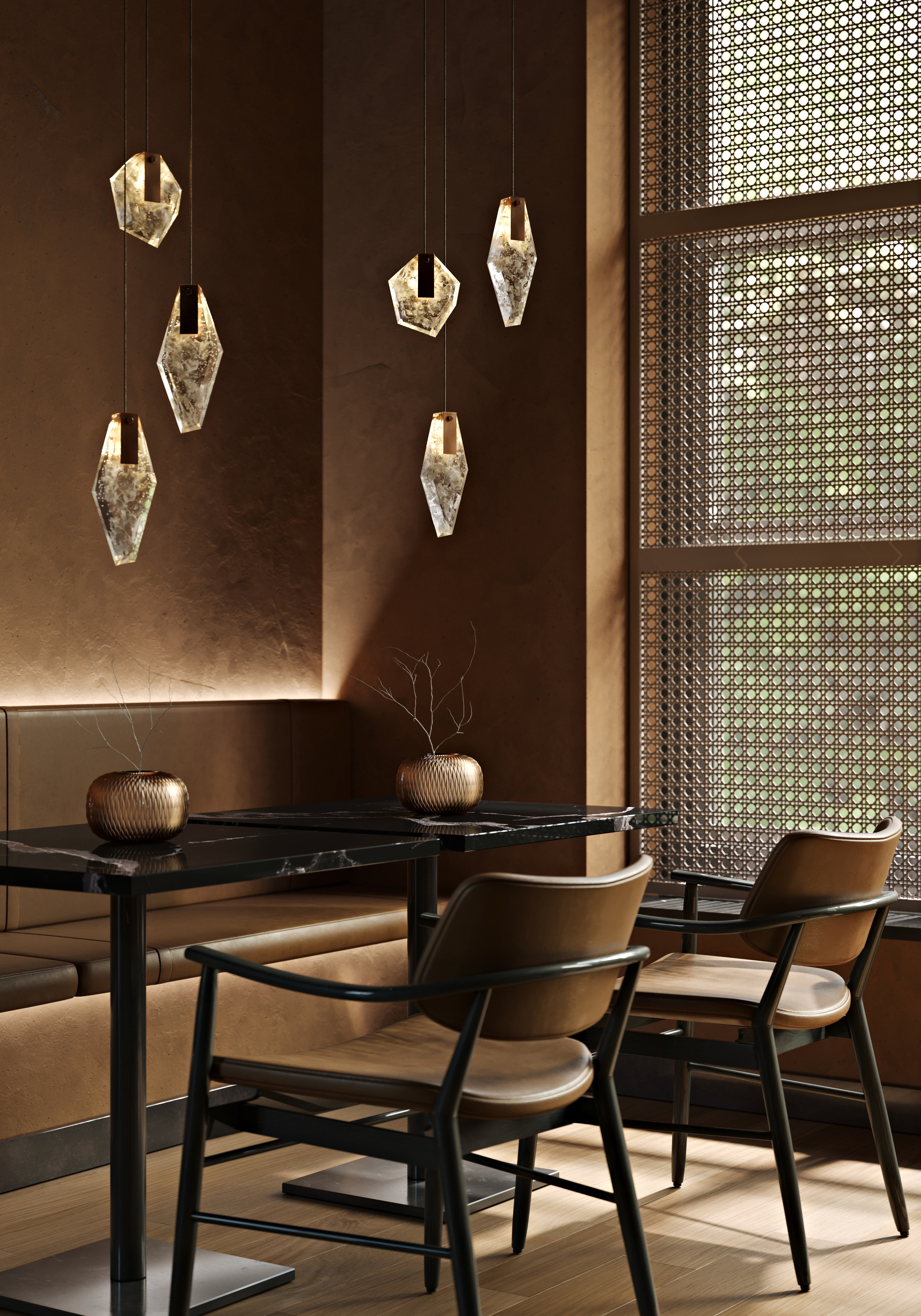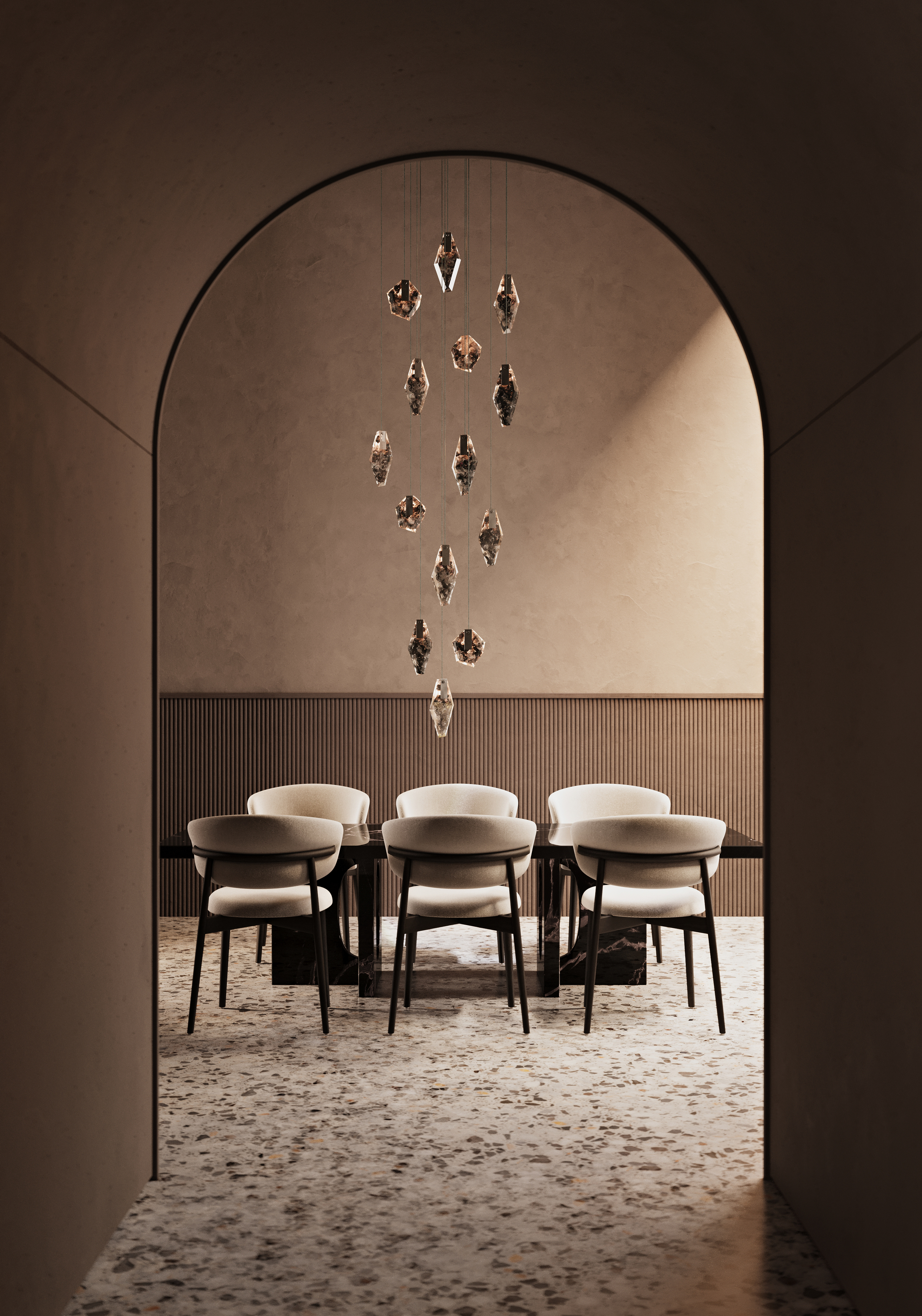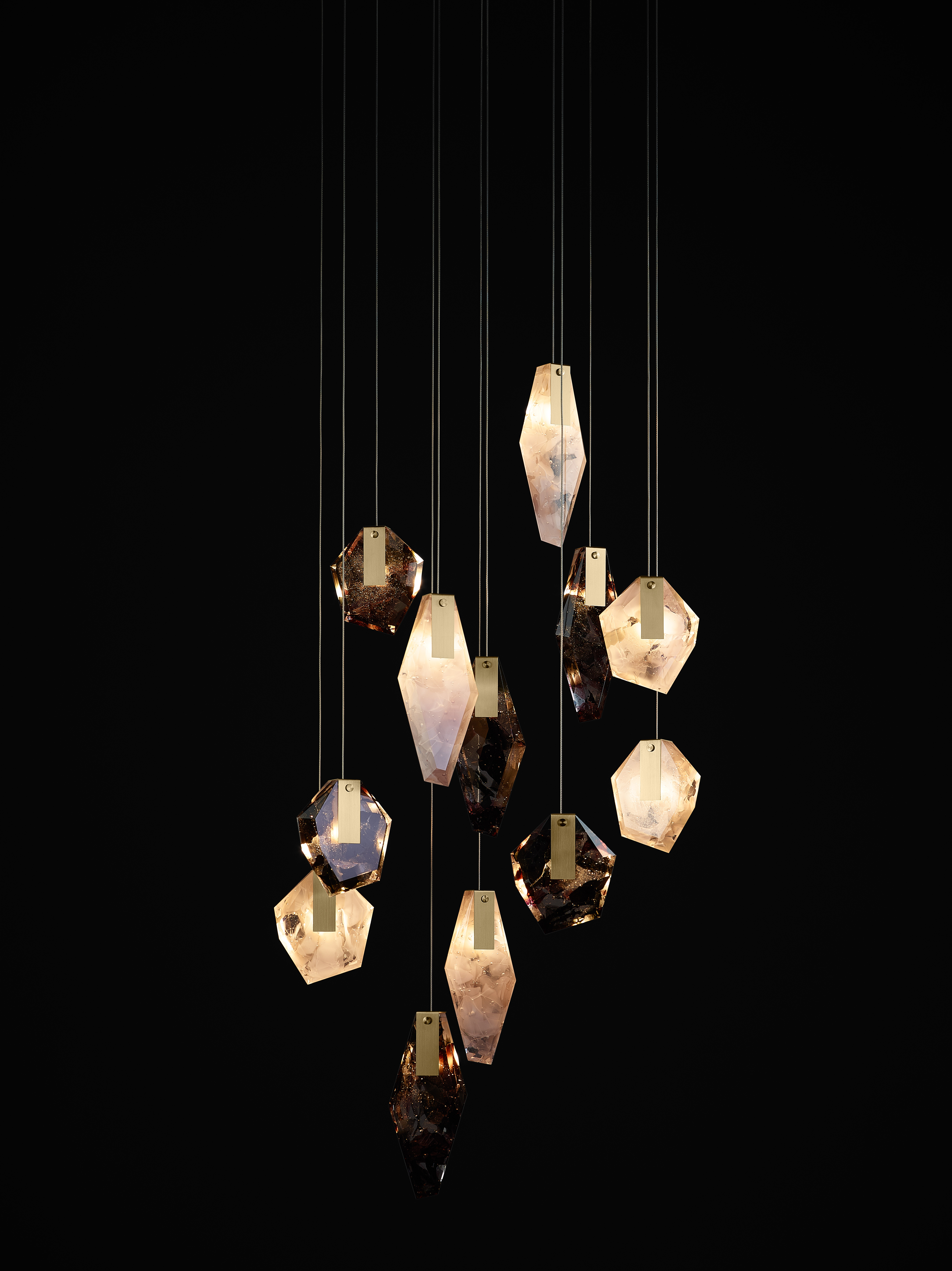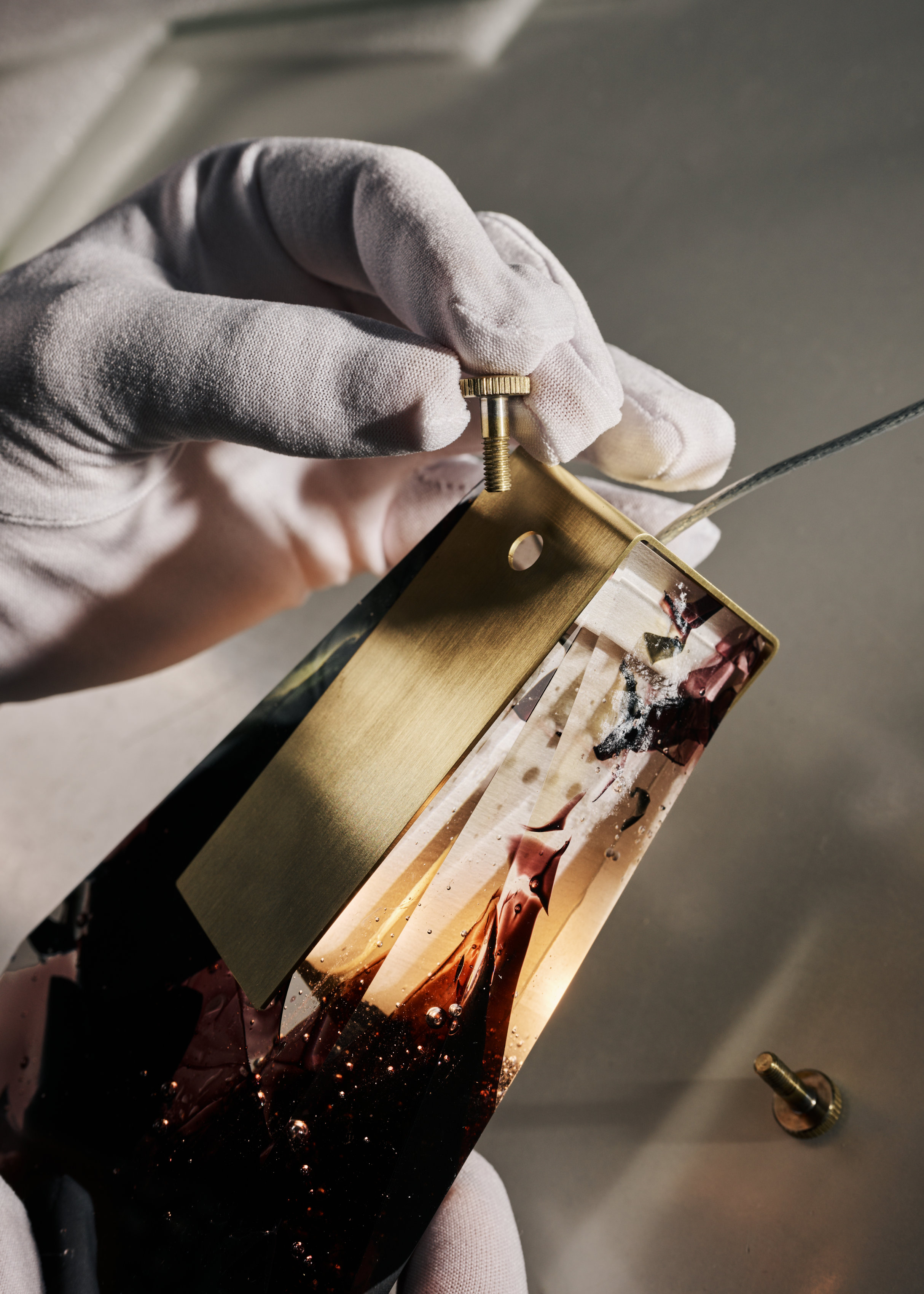 廃棄するものに新たな命を吹き込み、複雑なカラーとレイヤーがあるこのガラス素材は、空間に光と反射の魅惑的な輝きをもたらします。