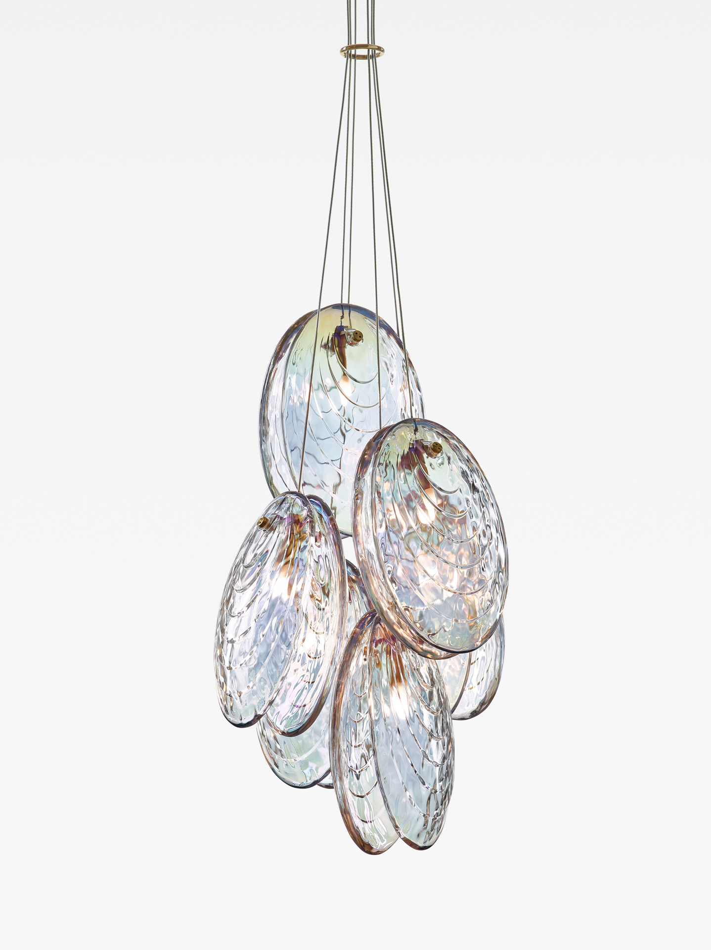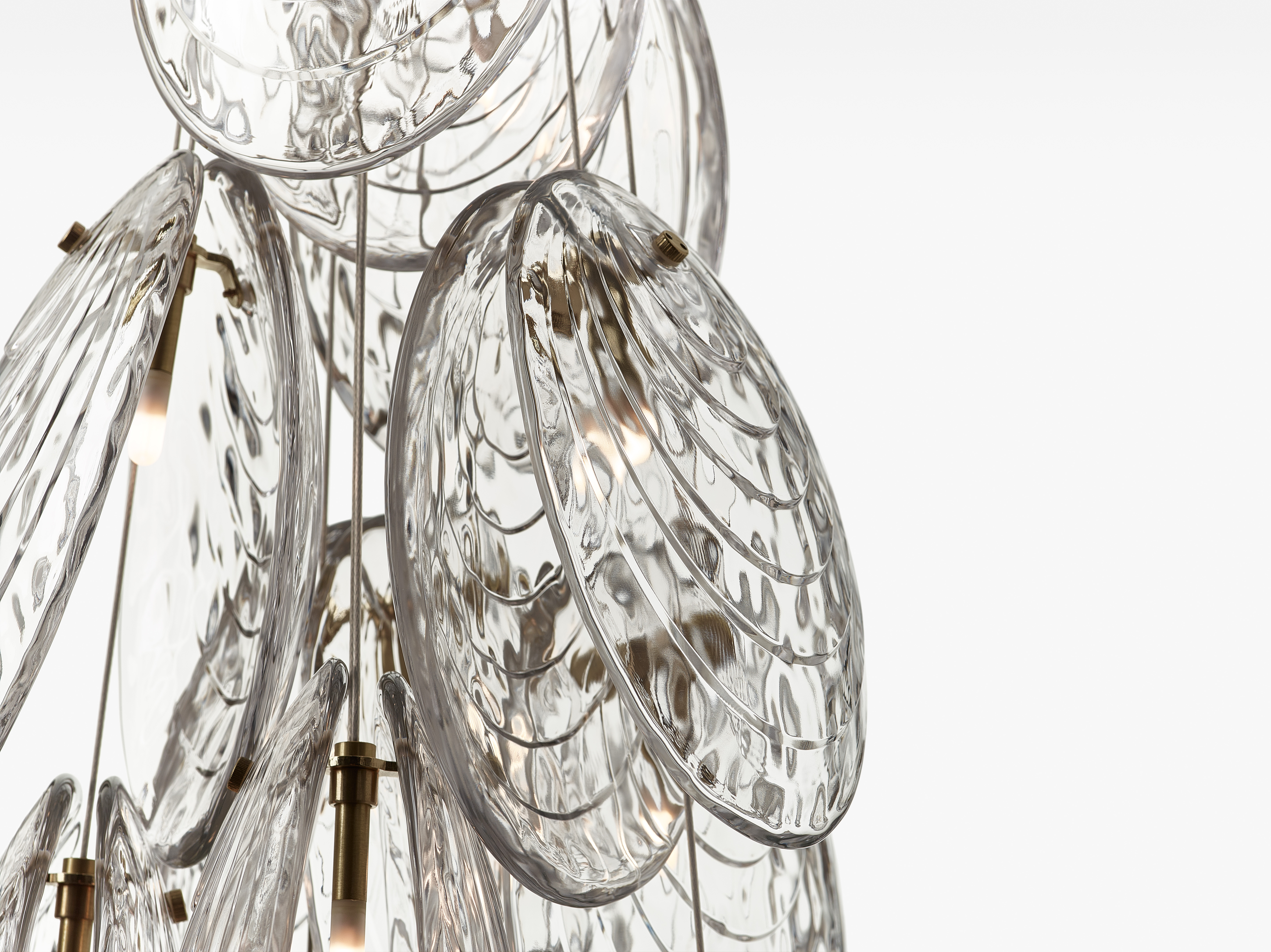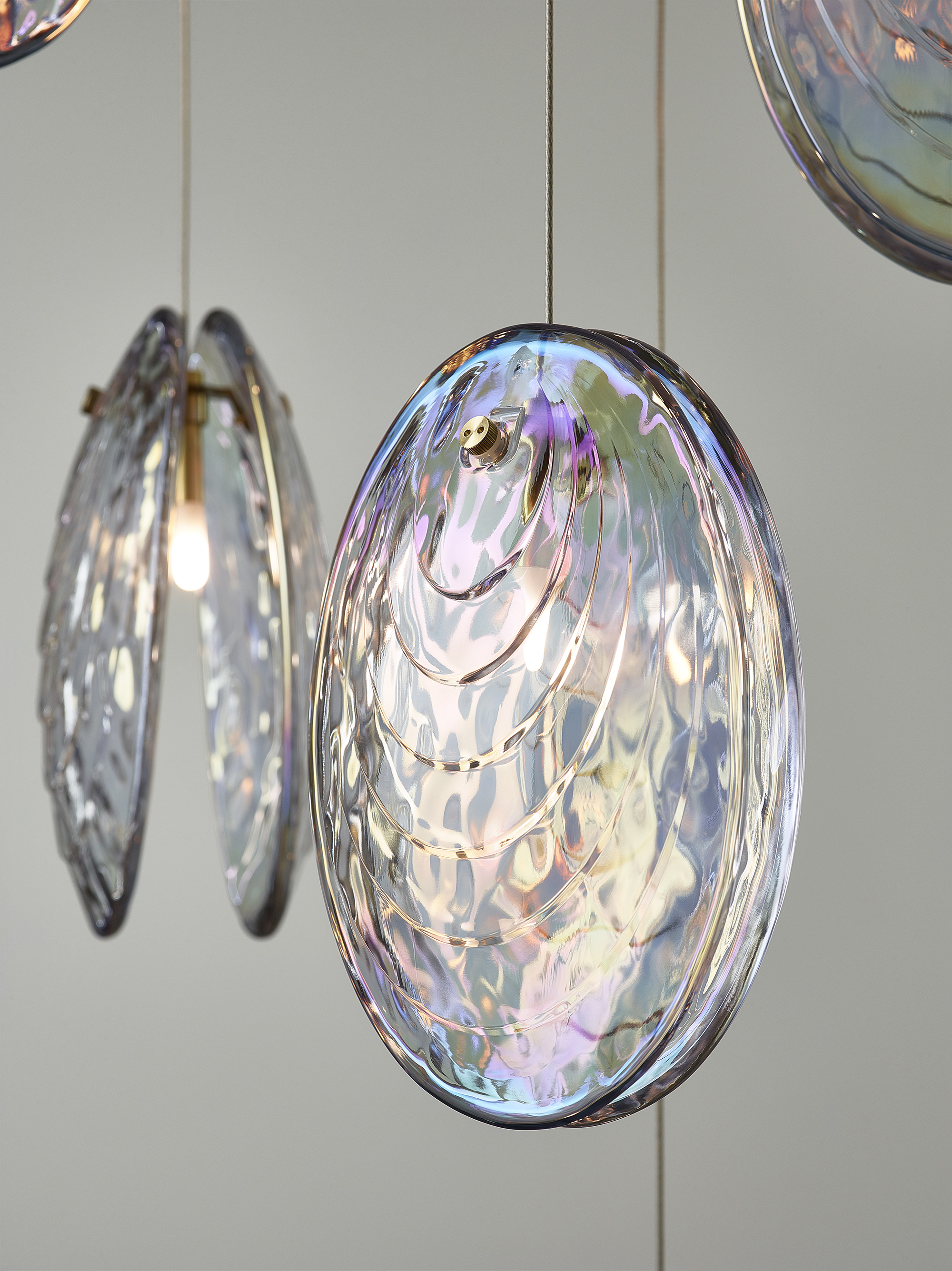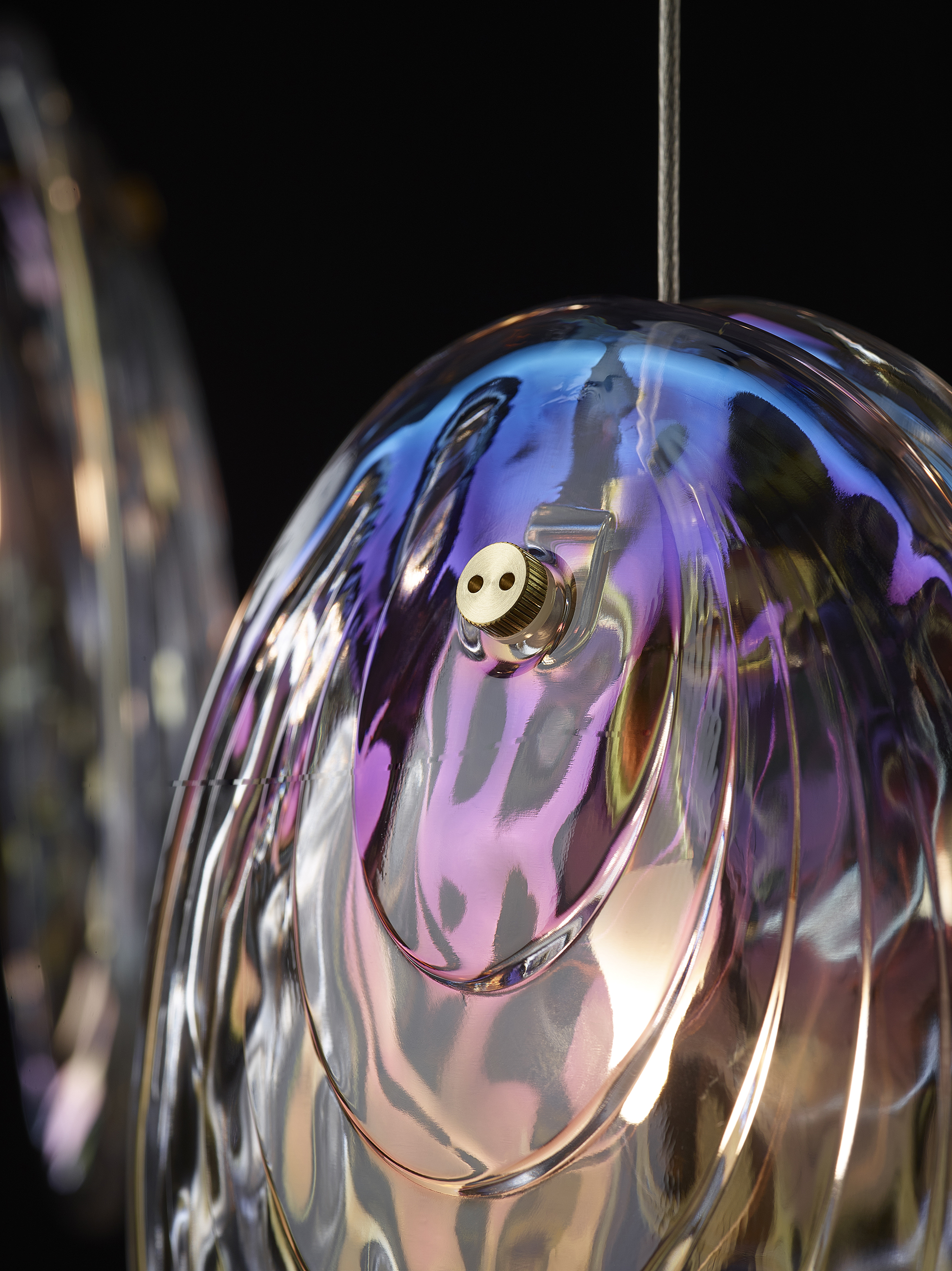 波紋のような模様が刻まれた2つのクリスタルガラスシェルに灯された光は、きらきらと水面に映る光のようです。