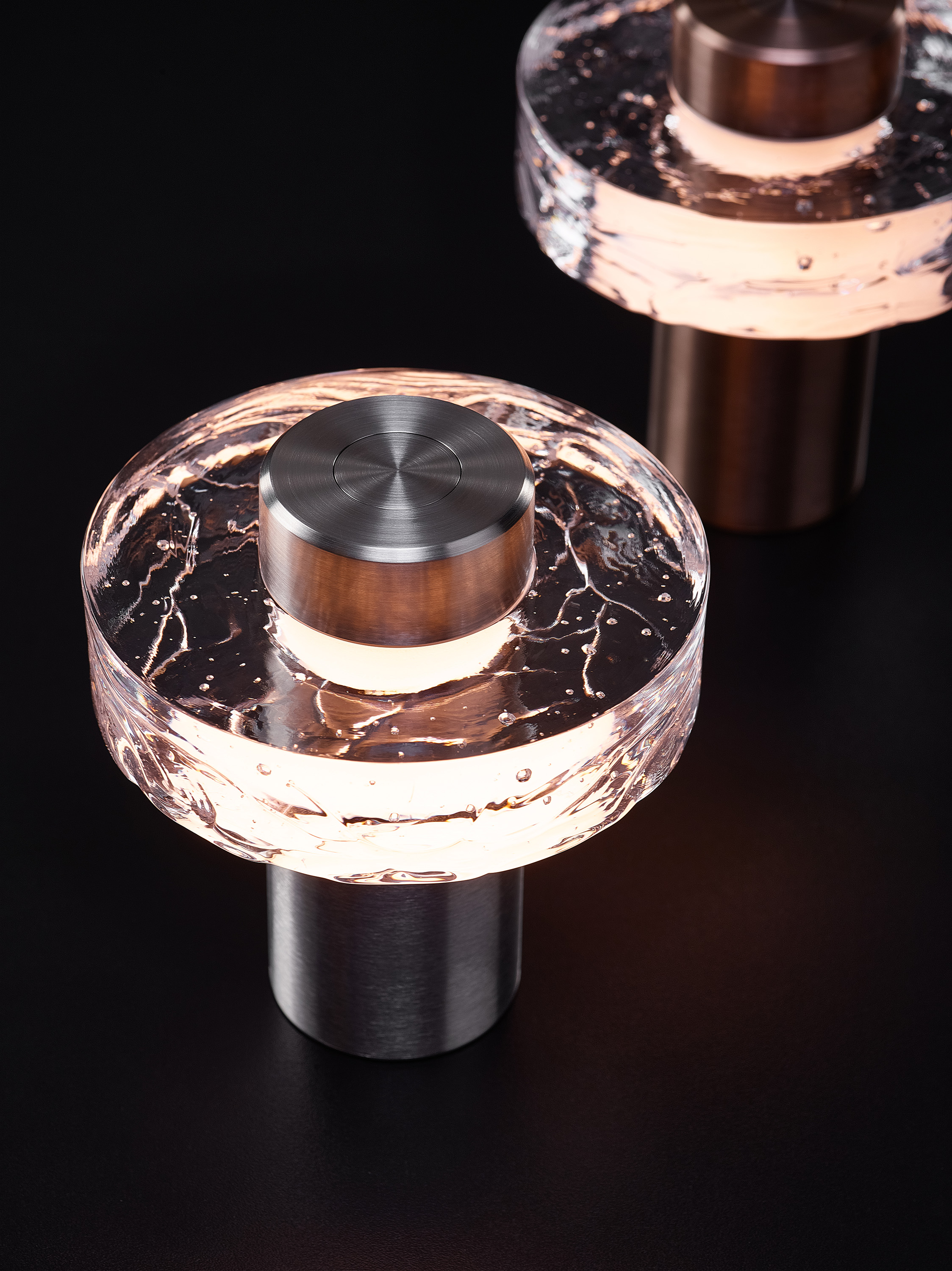 デザインの核心となるのは、存在感のあるガラスリング。その内部には、静かで魅惑的な小さな宇宙が広がります。