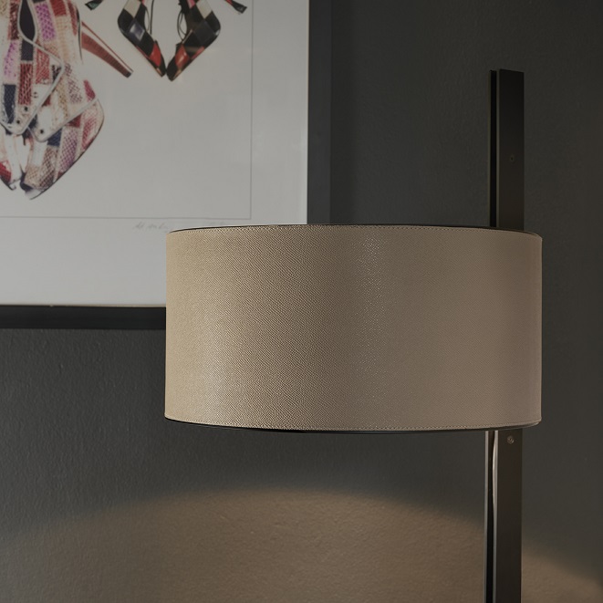 垂直な支柱に支えられた円筒形のメタル製シェードの